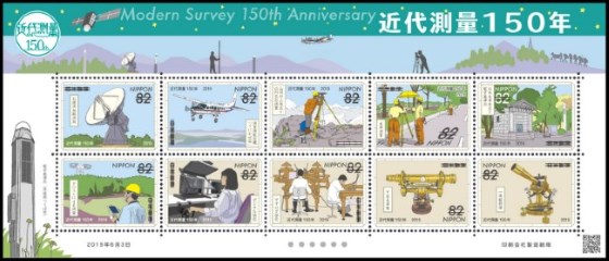 On June 3, 2019, in honor of the annual Surveying Day, Japan Post issued a sheet of 10 stamps marking 150 years of modern surveying in Japan. The horizontal formatted stamps all have JPY 82 (USD 0.75) denominations. The images on the stamps depict important surveying instruments, infrastructure, and surveying processes in Japan. Images depicting surveying tasks and historical surveying events during the 150 years are shown in the selvedge. The sheet marks 150 years since the Meiji Government, in 1869, established a modern surveying institute within the Ministry of Civil Service. The institute was tasked to compile a uniform land survey of Japan that would promote national governance. New offices in the government were setup to augment the family register with map data, collect information on place names, and compile a gazetteer. Teams were sent into the field to carry out comprehensive triangulation and leveling using Western surveying techniques. Work on compiling and maintaining a nation-wide 1:50,000 scale series of topographic maps was also initiated. After World War II and the end of the allied occupation, Japan entered a period of social and economic growth. The need for surveying increased to meet the demand in the areas of road maintenance and construction, housing and urban development, and the enhancement of disaster prevention infrastructure. The Ministry of Construction and the Geographic Survey Institute oversaw these projects and continued development in both technical and legal aspects of surveying. This period also saw the start of the private sector surveying companies in Japan. During the last 20 years significant advances from the field of information and communication technology have been incorporated into the surveying domain and those advances continue today and will for the foreseeable future.