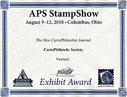 The Society’s flagship Journal, The NewCartoPhilatelist (TNCP), has received a Vermeil award at the recent APS/ATA StampShow 2018 held in Columbus Ohio during August 2018. Under the direction of Editor Martin Oakes, TNCP competed against a group of 19 other philatelic society journals. The officers of the Society would like to congratulate Martin on his editorial leadership in consistently providing our members with the one of the finest topical journals available today. In addition, it is also important to acknowledge the authors, who have written articles and provided content for our Journal over the years.