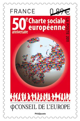 On September 9, 2011 LaPoste issued a single, 0,89 € stamp marking the 50th anniversary of the Council of Europe’s “Social Charter.” The European Social Charter is a Council of Europe treaty which guarantees social and economic human rights. It was adopted in 1961 and revised in 1996. The Council of Europe first met in 1961 and today has 47 member states and is home to over 800M citizens. The stamp features a sphere, viewed from space showing the member countries of the European Council covered in a background of member nation flags creating a map. There are silhouettes of people along the bottom of the stamp. [ Please let me know if there are any factual issues with this post. –web admin ]