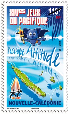 On March 18, 2011, New Caledonia’s Office of Posts and Telecommunications issued a single 110F denominated stamp to mark the [then upcoming] XIV Pacific Games that took place from August 27 – September 10, 2011 in Nouméa. New Caledonia was the official organizing host nation for the 14th gathering of the Pacific Games. The design of the stamp depicts an oblique like view of New Caledonia and the Loyalty Islands with a series of points that could indicate event venues or points along the torch relay. The NC 2011 logo is shown in the bottom left corner of the stamp. In the top center, Joemy, the mascot of the games is shown in the air above the islands holding the torch. Following the curvature of the globe, Joemy’s motto “Pacifique Attitude” is written. New Caledonia obviously demonstrated a lot of “Pacifique Attitude” as evident in the final medal standings. Congratulations to all the participants and the organizing committee! [ upon first glance the view of the islands and position of the mascot appears quite similar to a previous New Caledonia issue and favorite of cartophilatelists, sc#322. –web admin ]