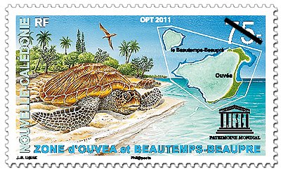 nications issued a single 75F denominated stamp with a map of the Ouvéa Atoll, part of New Caledonia’s UNESCO World Heritage Site. The stamp depicts a sea turtle on a sandy beach, with vegetation and a bird flying overhead. A map of both Ouvéa Atoll and Beautemps-Beaupré Atoll is shown in the upper right corner of the stamp. The UNESCO logo appears in the lower right corner. A large souvenir sheet was issued in December 2008 to mark the registration of the various lagoons around New Caledonia and the Loyalty Islands in the UNESCO register.