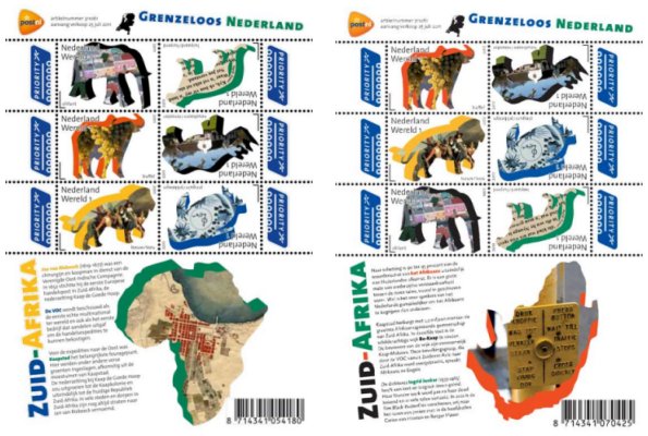On July 25, 2011 PostNL plans to issue three new sheets to commemorate historic relations between the Netherlands and South Africa. The sheets contain six, 1 wereld (approx. 95c) denominated stamps of the same design. On each of the sheets, the stamps are placed differently. On each sheet, the margin designs are also different. Maps related to South Africa are present in the lower margins of two of the sheets. The sheet on the left shows an old map of Capetown overlaid with the shape of the African continent. The sheet on the right depicts an image, cut in the shape of South Africa, of a street crossing sign with instructions in English and Afrikaans, which is very similar to Dutch. On all three of the sheets a small map of the Netherlands is visible on the top margin. [ Thanks to CPS Vice-President Mark Honig for this information! –web admin]