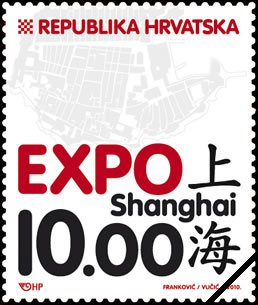 On April 29, 2010, Croatia Post (Hrvatska posta) issued what appears to be two map stamps marking the opening of the Expo 2010 in Shanghai China and Croatia’s participation in the Expo. The theme of Croatia pavilion at Expo 2010 is “Diversity of Cities, Diversities of Life.” This theme is also echoed in the two stamps. The first, a 10 kn (kuna) single adhesive depicts a block plan of the Old City of Dubrovnik in the background. In the foreground, the words “Expo Shanghai” in English characters along with the Chinese kanji for “Shanghai” and the denomination of the stamp are shown. The second stamp is part of a mini-sheet. The design and denomination of the stamp is the same as the first issue, the back ground of the mini-sheet is red and various lines in the background portray the subway network of the Shanghai Metro.