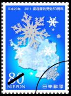 On June 23, 2011, Japan Post issued a sheet of 10 stamps marking the 50th anniversary of the start of the Antarctic Treaty. Ratified on December 1, 1959, the treaty went into force on June 23, 1961. The sheet from Japan contains five map 80JPY denomination stamps, of a common design, shown on the left. The continent of Antarctica is shown with a group of snow flakes, along with text at the top of the stamp marking the 50th anniversary of the start of the treaty. The map stamps share the sheet with five unique stamps of penguins.