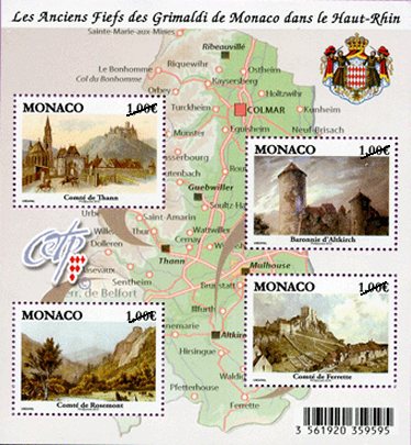 On May 24, 2010, the Stamp Issuing Office of the Principality of Monaco issued a 4,00€ mini-sheet showing a map of the former fiefs of the House of Grimaldi with four 1,00€ stamps showing castles set around the map. Information on the web site describes the history surrounding the sheet. Until the French Revolution, the Princes of Monaco were in possession of substantial fiefs in the French territory. The enjoyment of these Lordships originate, on the one hand, from the Treaty of Peronne, signed in 1641 with France and, on the other, from the alliance of the Sovereign House with two large French families: the Goyon-Matignon family and the Aumont-Mazarin family. In 1777, the son of Honoré III, Prince of Monaco, married Louise d’Aumont, descendant of the niece of the Cardinal of Mazarin and heiress, in particular, of the earldoms of Ferrette, Thann and Rosemont and of the barony of Altkirch. The map is detailed, show what appear to be present day roads and cities. The location of each castle is shown by an arrow to the city on the map. The coat of arms of Monaco is shown in the upper right corner of the sheet.