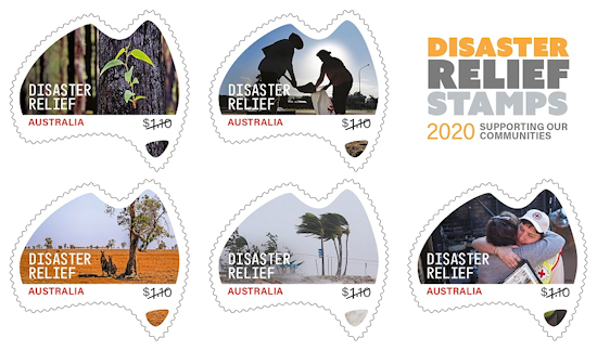 Stuart Hamilton, CPS Representative-at-Large, informed us that on February 18, 2020, Australia Post released a set of stamps each cut in the shape of Australia to raise funds for the disaster relief for the devastating bushfires of the previous 2019-2020 season. The 1.10 AUD denominated die-cut stamps depict an outline of the Australian continent and Tasmania and feature imagery of natural disasters. Australia Post will donate $2 to the Red Cross Disaster Relief and Recovery Fund from every stamp pack sold, to go towards the on-the-ground support for communities impacted by the bushfires and other disasters when they happen. There will be 100,000 Disaster Relief stamp packs produced, each containing five unique stamps. [thanks for the information Stuart, we are all thinking about our friends in Australia during this difficult time! – web admin]