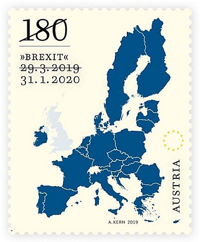 “Brexit” – the United Kingdom’s withdrawal from the European Union (EU) was slated to occur on March 29, 2019. From what we know, Austria Post planned to mark that date with a stamp depicting the EU, post Brexit, as shown in the stamp on the left. However March 29, 2019 came and went and the UK was still part of the EU. Rather than destroy the current stamps and commission a reprint, Austria Post waited. So when the UK’s withdrawal was ratified in late January 2020, Austria Post overprinted the stock with the “31-1-2020” withdrawal date and issued the stamps on January 31, 2020. News of the issue quickly spread on the Internet and many media outlets reported the stamps. Linn’s reports the stock of 140,000 sold out quickly from the Austria Post online store and demand for the issue resulted in listings of US$10 or higher on online auction sites, such as Ebay. The €1.80 denominated issue features a dark blue map of current EU members with the UK being shown in light blue after the withdrawal. A very light yellow color fills the background areas, as well as the lines make up the borders of the member countries and countries who are not EU members, such as Norway, Switzerland, and others are simply depicted as empty space areas in the background color. The word “»Brexit«” and the two dates are shown immediately below the denomination, in the upper left corner, with the 2019 date overprinted by a single horizontal bar. “AUSTRIA” rotated 90 degrees with a left to right reading flow. Above the text is the EU 12 golden star circular logo. It was noticed in the very lower left corner of the stamp a small blue patch is visible, and present on every stamp. Theories on the CPS members discussion list point to this patch possibly being the Portuguese autonomous island of Madeira. The map depicted on the stamp is quite detailed, with a number of other small islands clearly visible in both the Adriatic and Aegean seas. [ correction to update the sovereignty of Madeira — thanks Pierre! ]