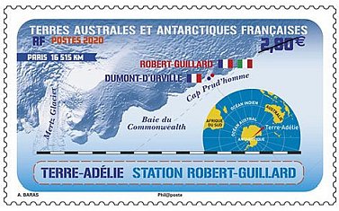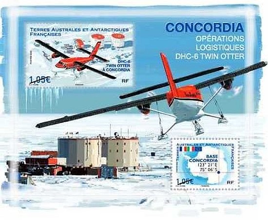 In the January 2020 TAAF (French Southern Antarctic Territory) series from La Poste, a couple of the issues contained maps. In a set of two stamps marking the joint French/Italian Station Robert Guillard near Cap Prud’homme in Adélie Land (Terre-Adelie) one stamp contains a map (right). The €2.80 stamp depicts the location of Station Robert Guillard which is located nearby the French Dumont d’Urville Station. The location of the stations along the shoreline are marked by points and national flags. A relief shaded map of the ice sheet and Mertz Glacier fills the remaining center portion of the stamp. What appears to be a partial polar-sterographic projection is positioned on the lower right side of the stamp. France’s Terre-Adelie territorial claim is marked in red. The next TAAF issue containing a map is a mini-sheet of two stamps (below) with the background showing a photograph of the joint French/Italian Concordia Base, located 1,100 km (680 mi) inland from the Dumont d’Urville Station. The main theme of the mini-sheet appears to be the DHC-6 Twin Otter airplane used for logistics between the bases. The plane is shown in the center of the sheet and in the €1.05 denominated stamp (upper left) which also depicts an aerial view of the base. A map of Antarctica is depicted in the other stamp (lower right). The €1.05 denominated map stamp shows French, Italian and EU flags along with the geographic location (lon/lat) of the Concordia Base, in the Australian Antarctic Territory.