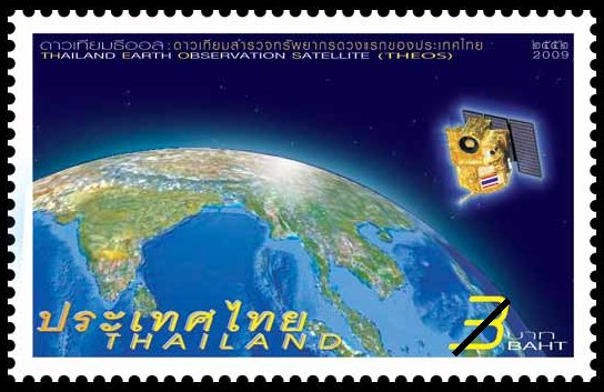 While not the first map stamp issue of 2010, Thailand Post’s Theos issue of December 5, 2009 is sure to be high on the list of important cartophilatelic issues of the previous year. The 3.00 Bath stamp was issued to mark the launch of Thailand’s first Earth Observation Satellite (EOS), on October 1st, 2008. The platform has two cameras, a panchromatic and multi-spectral with resolutions of 2m and 15m respectively. The multi-spectral sensor has 4 bands (B,G,R,NIR). The platform is very versatile supplying imagery for natural resources management, agriculture and vegetation monitoring. The 2m data is suitable for cartographic applications, land use monitoring, and security applications. The satellite was built by EADS Astrium and is operated by Thailand’s Geo-Informatics and Space Technology Development Agency (GISTDA). You can even track the satellite and others using this link. [ two years ago i had the honor of visiting GISTDA and one of their ground station facilities. it was very fascinating to learn about the infrastructure and the researchers of GISTDA were very excited about the upcoming launch of THEOS. THEOS is one of many EOS that monitor the planet daily, providing massive amounts of data for scientific research. ]