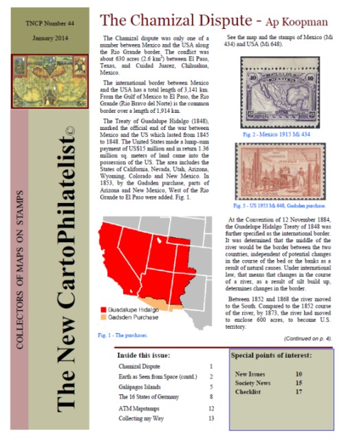 The dispatch of the 44th issue of The New CartoPhilatelist marks a turning point for the Society. This issue was printed and dispatched directly to all of our hardcopy members, both domestic and international, using HP’s MagCloud Service.  The first issue of the new year starts out with a detailed article by Ap Koopman about The  Chamizal Dispute regarding the border between the USA and Mexico.  The article traces the dispute over time, culminating with the treaty signed in 1963 and depicted in a stamp issue.   Next up we have the final installment by meteorologists Don Hillger and Garry Toth who have presented a number of issues related to looking at The Earth as Seen from Space. Their descriptive article traces the history of geostationary earth observation satellites and various full disk earth images as they are shown on a number of stamp issues. Be sure to check the author’s web site for a very comprehensive checklist of related issues.  Next up is a fascinating article about the Map stamps of the Galápagos Islands, by member Roger Kirby.  The article begins with an interesting fact — approximately one third of the postage stamps of the Galápagos Islands issued up until 2012 have been map stamps.  The article provides a very in-depth introduction to a very unique collecting theme.  The Society’s European Representative, Volker Woesner, presents an article about the states of Germany as depicted in stamps.  The article begins with a popular set of stamps issued from 1992 to 1994 stamps by the newly unified German Post  depicting all 16 “federated states”, which constitute Germany today. The article continues to examine Germany’s historical borders through cartophilatelic examples.   Society vice-president, David Wolfersburger opens the new year with an article about the newly released Maps on Stamps Checklist Rev 6.01 and showcases a number of new issues.   Society member Pierre Moïse updates us with the status of maps shown on ATM stamps. A very interesting and growing group of issues which everyone show take notice of.  One catalog already seems to be describing many of these issues.  Next up is an informative article from TNCP Editor Martin Oakes detailing how he is arranging and annotating his collection. It provides a number of really neat ideas that new collectors and veterans alike will want to check out.  A brief side-bar about a series of errors appearing on Austria’s 2012 issue commemorating the EU. How many of these errors are in your collection?  Society President Mark Honig rounds out this issue with Society News and an examination of news on map stamp references in the current philatelic press and a look at some recent map stamp auctions.  The issues closes again with information about a raise in membership dues caused by recent postal rate increases,  updates to the checklist, some images of maps on labels/gutters of stamps related to nature, and a number of recent new issue images.