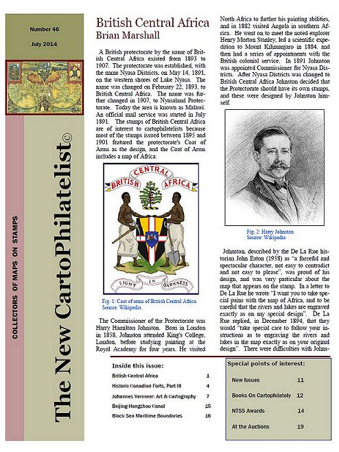 The 46th issue of The New CartoPhilatelist has been dispatched to members. All hard copy members received their journals shipped via HP’s MagCloud PoD service. The46th issue of the Society’s award winning Journal is full of fascinating articles, news, and images. Be sure to check out the contents of this exciting issue. Some highlights in this issue are a very interesting and in depth article by Society Asia/Pacific Representative Brian Marshall on the history of the first postage stamps of the British Central Africa Protectorate. A number of early sets have a subtle but accurate map of the African continent uniquely designed into the Coat of Arms of the Protectorate. The third installment in the series of the Historic Canadian Forts issues of the 1980’s and 1990’s, by James C. Hamilton. Mark Honig reports about the informal CartoSummit that took place in Berlin in early June 2014. David Wolfersberger looks at Art, Cartography and Stamps, through the paintings of Johannes Vermeer. President Emeritus Miklos Pinther take a look at Books on CartoPhilately, with a description of some very interesting non-english works on the subject. Be sure to check out the information on the checklist update of items from T. Nishiumi’s Japanese language book. On pages 14-15 there some images and announcement of the Gold Medal that The New CartoPhilatelist Journal won at the ATA’s 65th National Topical Stamp Show (NTSS) in June 2014. Congratulations to the authors and Martin, our Editor! Member Ang Kian Kee reports about a unique souvenir sheet from China depicting the famous Beijing-Hangzhou Canal, a UNESCO World Heritage Site and the oldest and longest constructed canal in the world. Ap Koopman looks at the interesting and timely topic of Black Sea Maritime Boundaries. Miklos Pinther keeps us informed of some recent auctions of cartophilatelic importance. The issue is rounded out with updates to the MoS checklist, new issue images, a brief notes about the new CPS members email discussion list and dues notices. Unfortunately there was a sad note to report that long time member Ed Stresino passed away in May 2014. Read about Ed’s contributions to our Society over the years. We were fortunate to have had Ed as an active member of the Society. Our condolences to Ed’s wife and family.